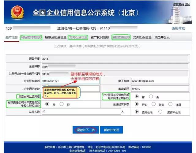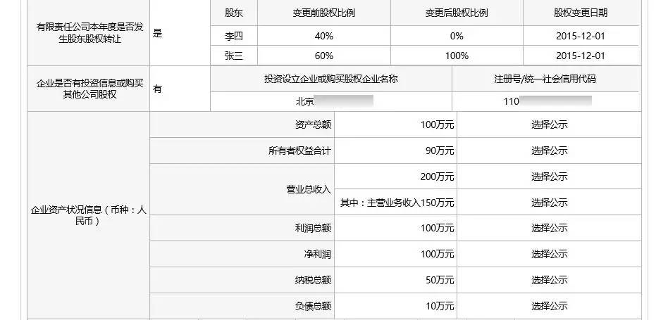 进入填报页面。企业根据实际情况选择“是否有网站或网店”、“有限责任公司本年度是否发生股权转让”、“企业是否有投资信息或购买其他公司股权”,如选择“是”,则必须填写“网站或网店信息”、“对外投资信息”、“股权变更信息”。