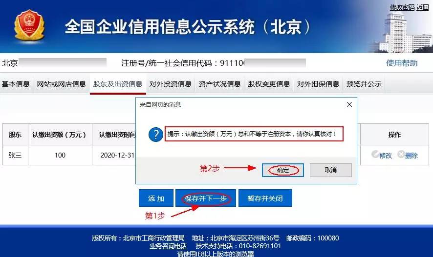 当企业填报的认缴出资额合计不等于注册资本金时,系统会弹出提示信息,请认真核对。如股份有限公司发起人当前的认缴出资额确实与注册资本金不等时,点击“确定”进入下一步。