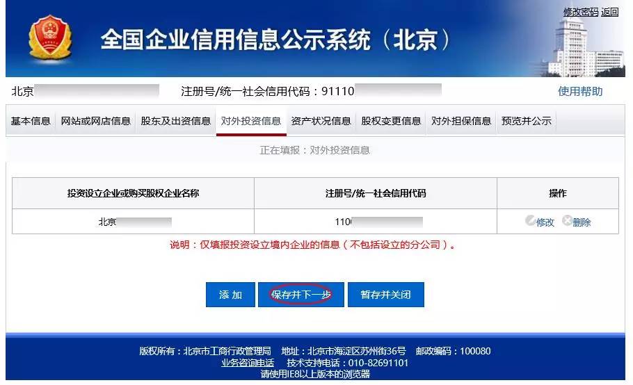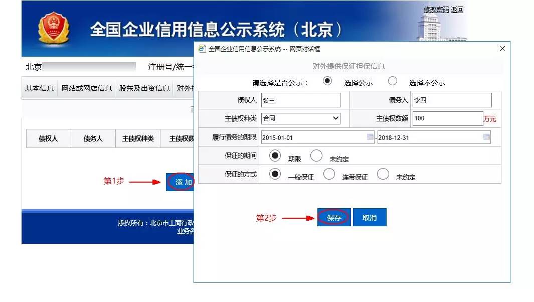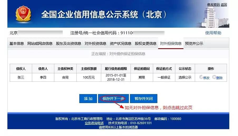 填写“对外提供保证担保信息”。对外提供保证担保信息是指截止到年报年度有效的担保信息,该信息为非强制性公示的事项,企业可自行选择是否向社会公示。如企业当年度无对外提供保证担保信息,则无需填报,直接点击“保存并下一步”进入下一页面。