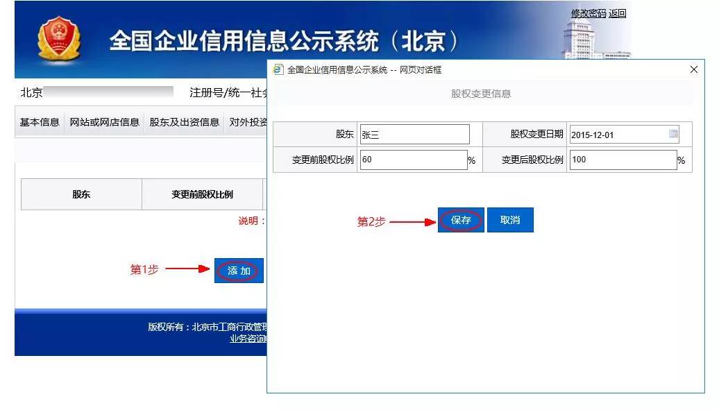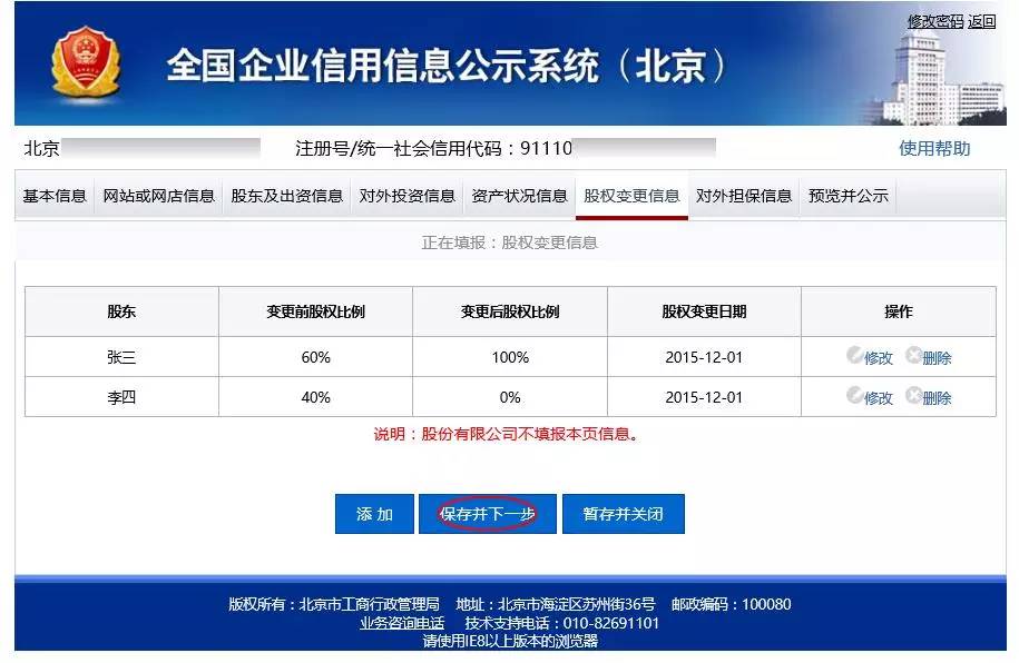 填写“股权变更信息”。企业填报2015年当年度的股权变更情况。