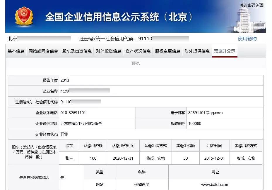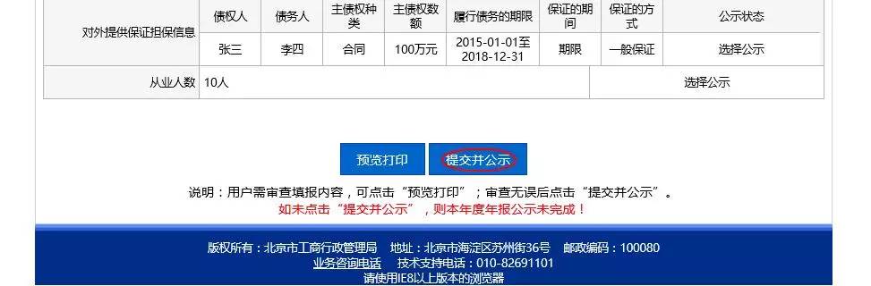 预览打印与提交并公示。企业确认信息无误,可提交并公示年报信息。